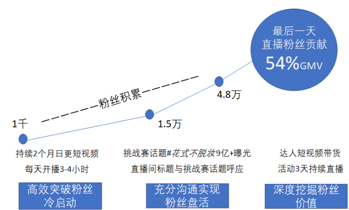 之后,發起#花式不脫妝#超級挑戰賽,期間直播間標題與挑戰賽話題呼應,迅速帶來3倍粉絲增長。