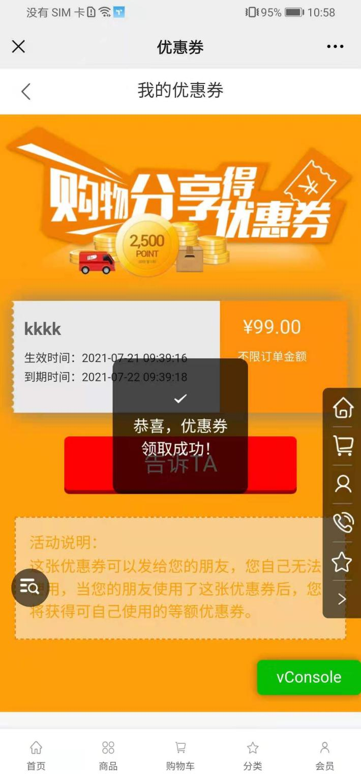 用戶場(chǎng)景:購(gòu)物分享得優(yōu)惠券活動(dòng),在小程序優(yōu)惠券點(diǎn)擊送給TA可以正常使用