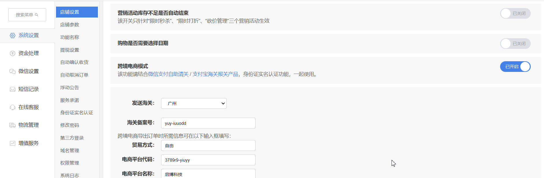 (1)開啟“身份證號(hào)碼”、開啟“跨境電商模式”、開啟“身份證實(shí)名認(rèn)證”、開啟“驗(yàn)證訂購(gòu)人姓名”