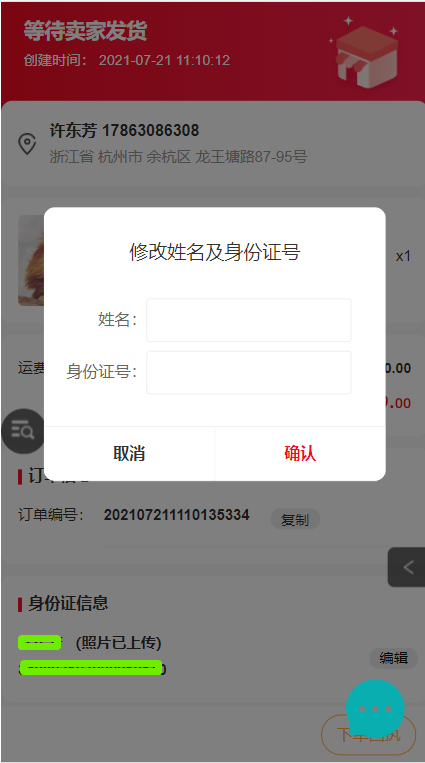 (3)手機(jī)端物流詳情點(diǎn)擊編輯,彈出修改姓名及身份證號(hào)彈窗