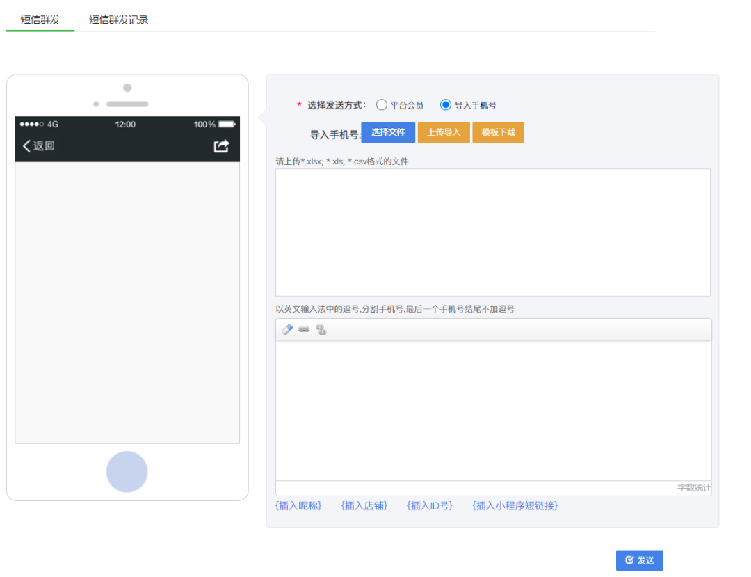 ① 短信群發:以短信的形式發給商城內的會員、分銷商、代理商、訂貨商等用戶,也可以導入手機號到平臺內,將短信發送給這批自定義用戶;