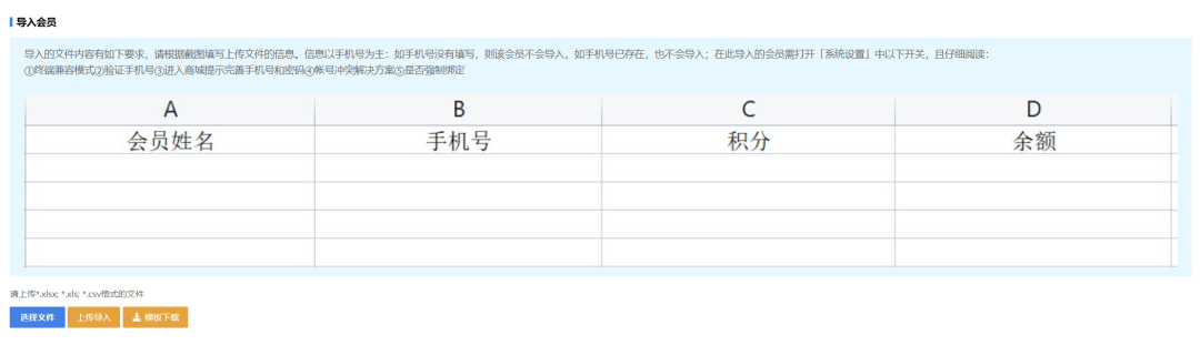 信息以手機號為主:如手機號沒有填寫,則該會員不會導入,如手機號已存在,也不會導入;