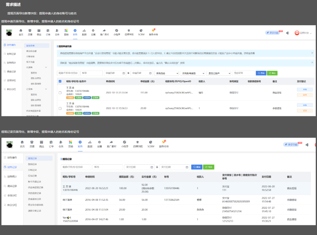 2、提現記錄導出新增手機號【新增】;