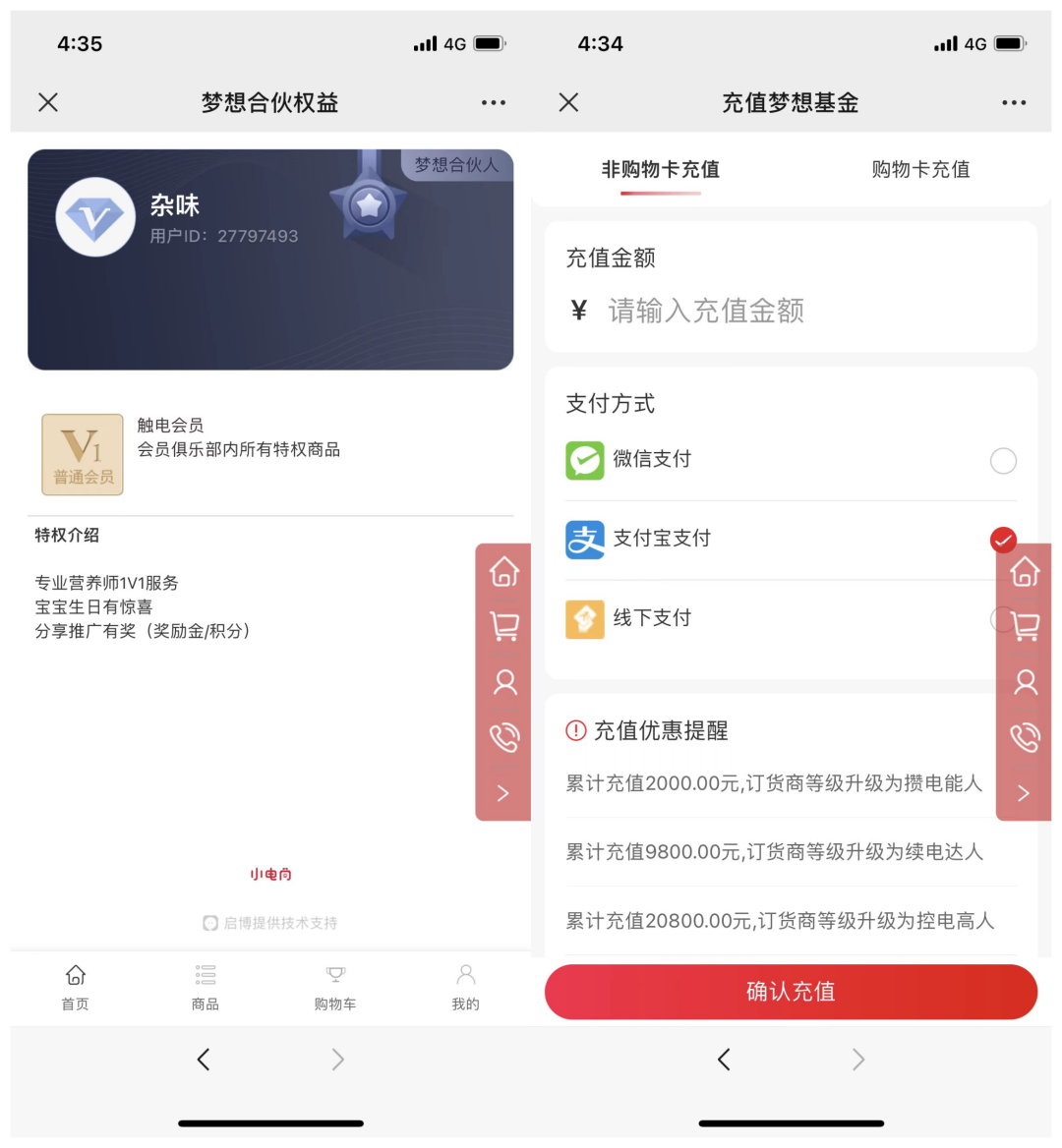會員等級:進入小電筒小程序商城注冊即自動成為V1等級的觸電會員;當累計充值金額達2000元,可升級成為訂貨商“攢電能人”;累計充值金額達9800元,可升級成為訂貨商“續電能人”;累計充值20800元,訂貨商等級升級為“控電高人”;累計充值70000元,訂貨商等級升級為吸電強人;累計充值180000元,訂貨商等級升級為滿電超人。