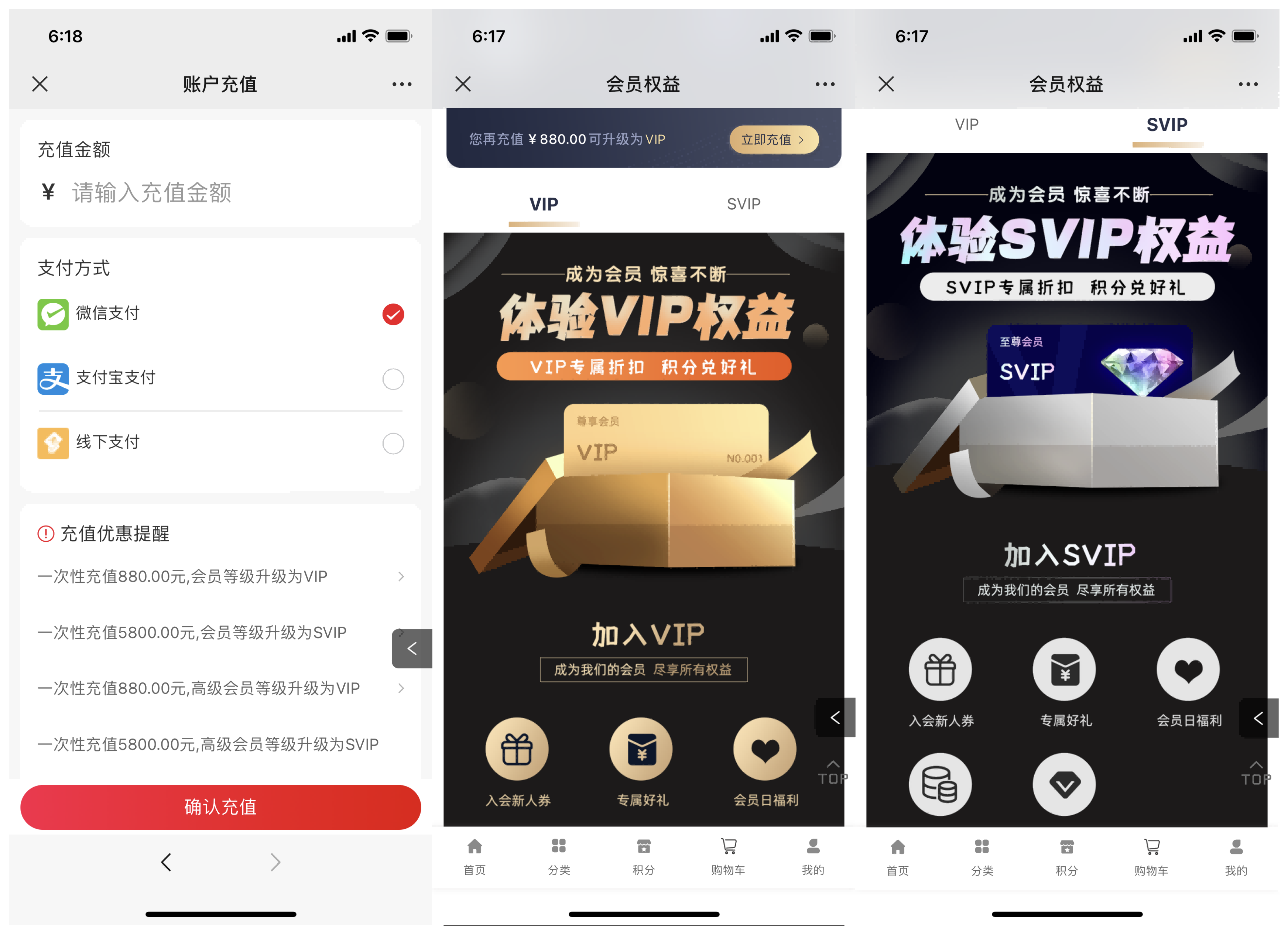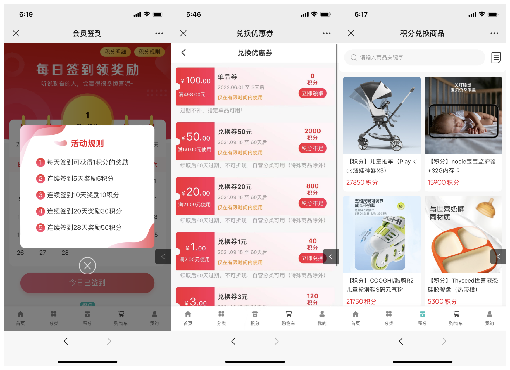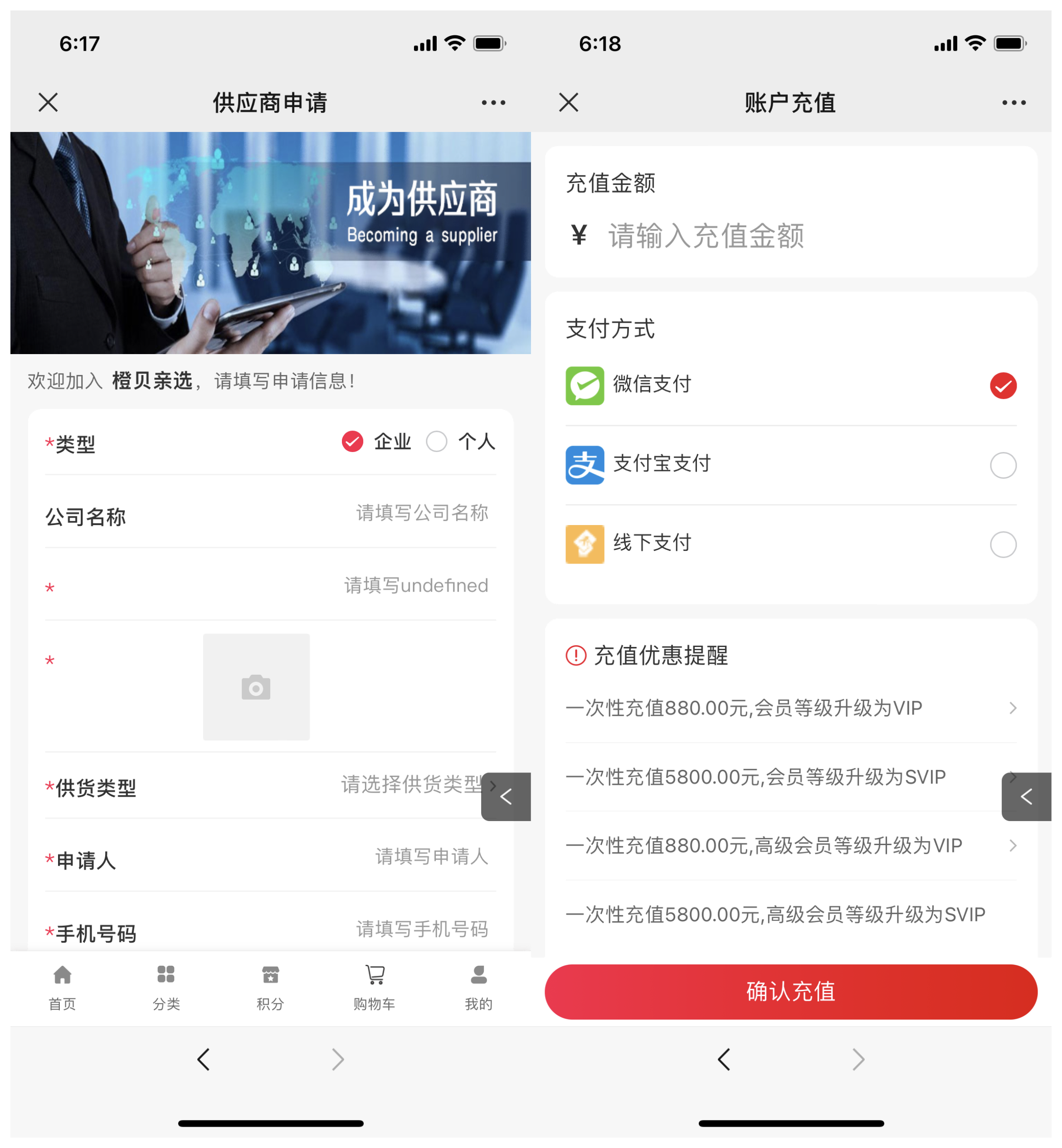 橙貝親選合作啟博微分銷系統,搭建了微商城和小程序商城,一店雙核商城分布由“首頁”、“分類”、“積分”、“購物車”、“我的”五大模塊構成。