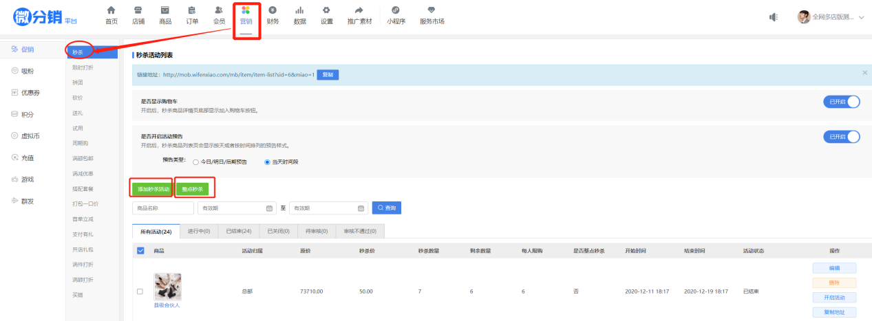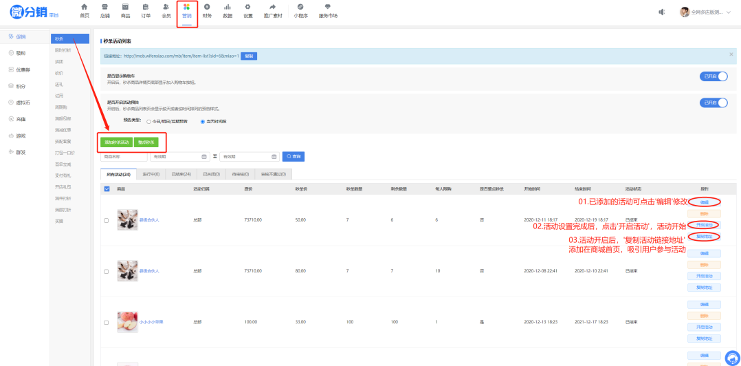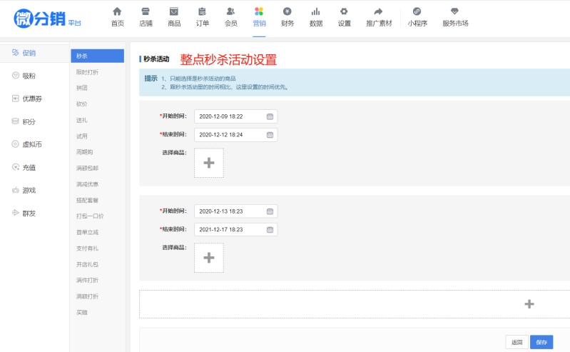 1、如何在啟博微分銷商家管理后臺創(chuàng)建一場“限時秒殺”活動:
