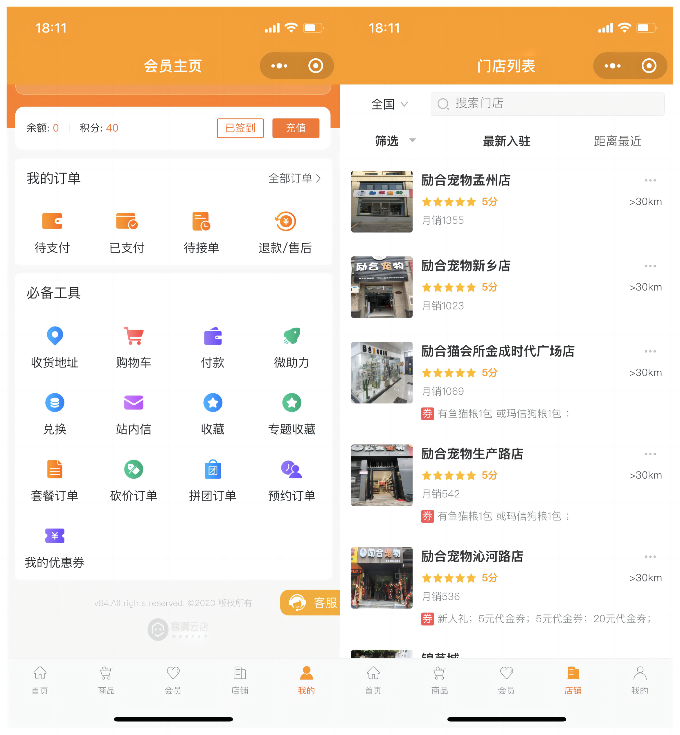 小程序商城內所有非服務類的商品,都支持到店自提或者快遞到家,消費者可以自定義選擇距離自己最近的勵合寵物門店自提。