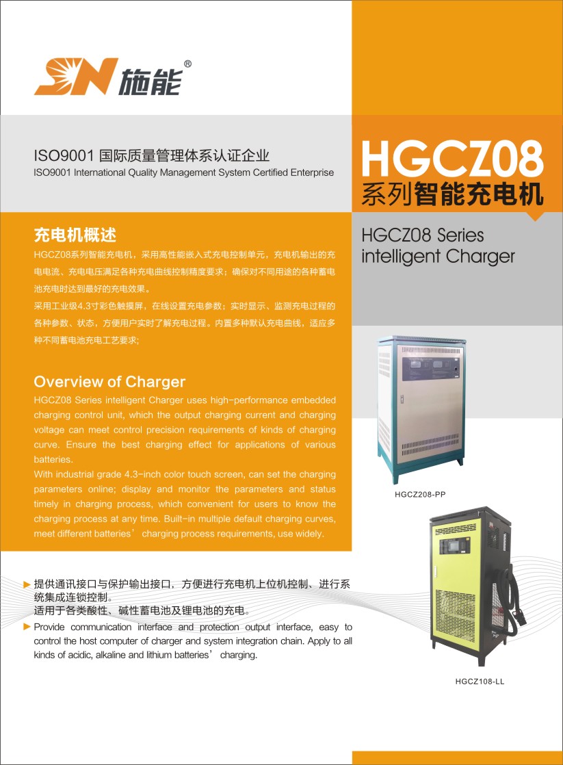 HGCZ08系列智能充電機用高性能嵌入式充電控制單元控制充電電流,通過參數優化設計的主電路,為各種蓄電池、鋰電池提供連續可調的充電電流,滿足各種充電工藝要求。