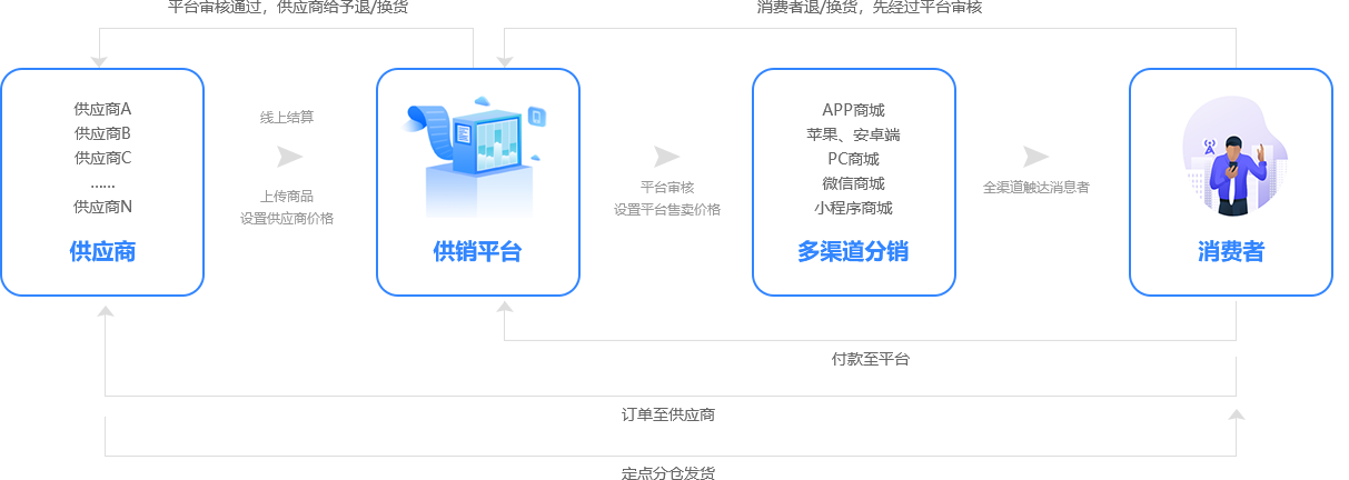 上游多用戶直接供貨銷售,下游多渠道觸達(dá)消費者,幫您打造小京東、小天貓模式